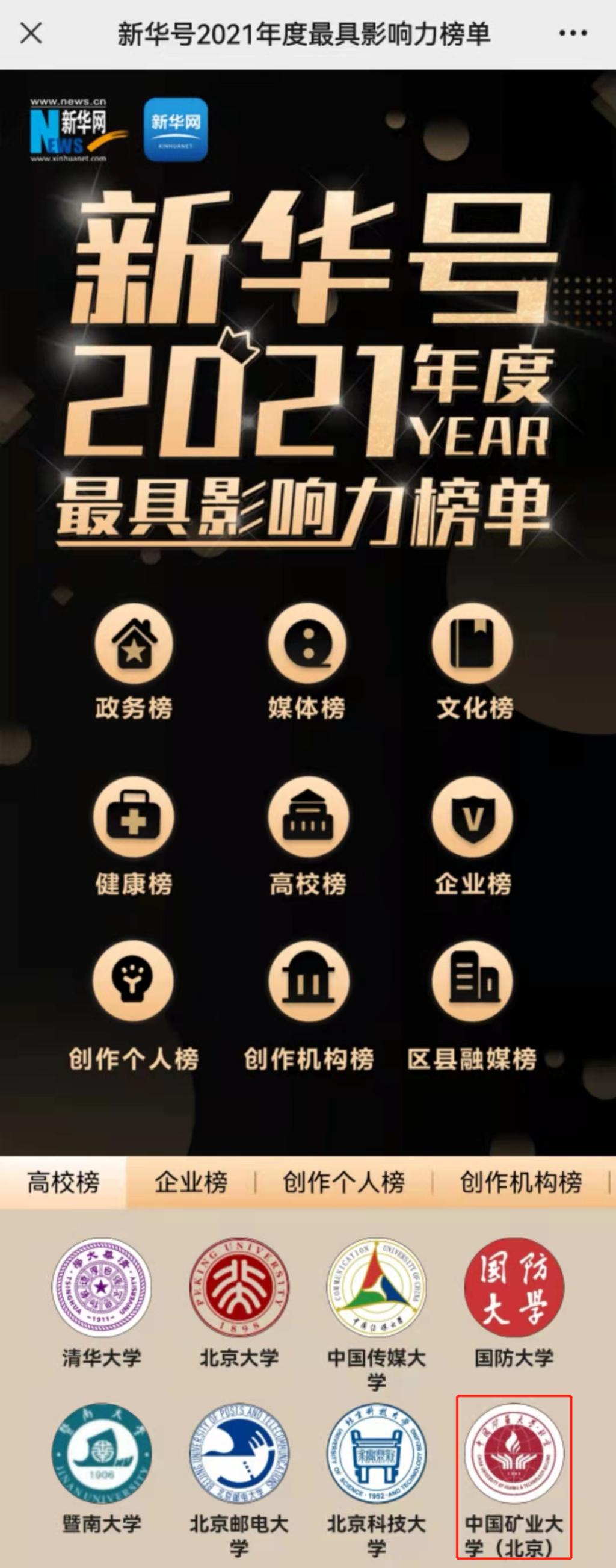 本网讯 近日,新华网客户端新华号正式公布《2021年度最具影响力榜单》,中国矿业大学(北京)荣获2021年度新华号“最具影响力高校”荣誉称号。