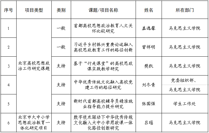 本网讯 日前,北京市委教育工作委员会公布了2023年度北京高校思想政治工作研究课题中标名单,和2023年度北京市大中小学思想政治教育一体化研究项目立项名单。我校共6项课题获批立项,其中一般课题2项,支持课题4项。