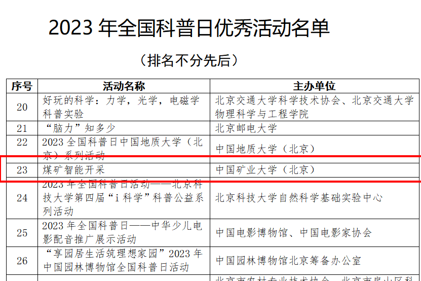 本网讯 近日,中国科学技术协会公布了2023年全国科普日活动考核结果,经综合评议,共有1749个活动评为2023年全国科普日优秀活动。我校申报的“煤矿智能开采”科普活动成功入选2023年全国科普日优秀活动。“煤矿智能开采”展项作为煤矿领域唯一科普活动入选由中国科协、北京市人民政府会同20个国家部委共同主办的2023全国科普日主场活动,参展期间累计吸引超20000人次驻足观看,3000余人沉浸体验,累计为10000余人进行科普讲解,受到中央广播电视总台、人民日报、科技日报等媒体的关注报道。该展项得到了国家自然科学基金专项项目(科学传播类)“煤炭资源安全智能开采科普活动(42042043)”支持。参展人员有我校副教授张村,博士研究生陈彦宏,本科生秦晨阳、马嘉钦、贾策元、王子琛等。